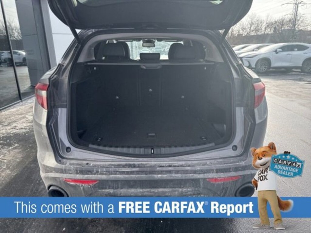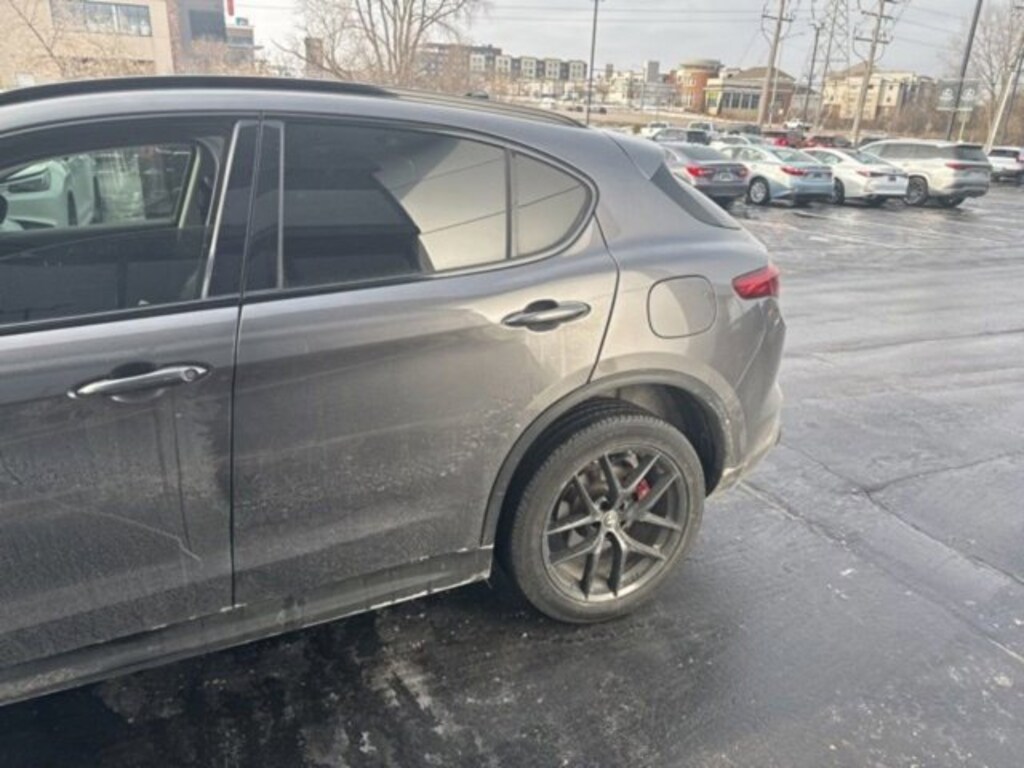 This Stelvio is well equipped with Active Blind Spot w/Front Park Sensor (Active Blind Spot Assist, Auto-Dimming Exterior Mirrors, Front/Rear Park Assist System, Perforated Leather Shift Knob, and Sport Leather-Wrapped Steering Wheel), Cold Weather Package (Heated Front Seats, Heated Steering Wheel, and Heated Washer Nozzles), Nero Edizione (Colored Brake Calipers, Dark Exhaust Tips, Dark Miron Badging, Dark Miron Exterior Mirror Caps, Dark Miron V Scudetto Grille, Gloss Black Roof Rails, Gloss Black Window Surround Moldings, Miron Black Rear Valence Panel, Monochromatic Center Wheel Caps, and Wheels: 20" x 8.5" Miron Black Sport Aluminum), Quick Order Package 22M, Apple CarPlay & Android Auto, Dual-Pane Sunroof, ParkView Rear Back-Up Camera, Power Liftgate, Wireless Charging Pad, 3.73 Axle Ratio, 4-Wheel Disc Brakes, 8 Speakers, 8.8" Touchscreen Display, ABS brakes, Air Conditioning, Alloy wheels, AM/FM radio: SiriusXM, Auto-dimming Rear-View mirror, Automatic Temperature Control, Body Color Appearance Kit, Brake assist, Bumpers: body-color, Compass, Delay-off headlights, Driver door bin, Driver vanity mirror, Dual front impact airbags, Dual front side impact airbags, Electronic Stability Control, Four wheel independent suspension, Front anti-roll bar, Front Bucket Seats, Front Dual Zone A/C, Front reading lights, Fully Automatic Headlights, Garage door transmitter, Gloss Black Shark Fin Antenna, Gloss Red Calipers w/White Script, Heated Door Mirrors, Heated Rear Seats, High intensity discharge headlights: Bi-Xenon, Illuminated entry, Knee airbag, Leather Seats, Leather Shift Knob, Leather steering wheel, Low tire pressure warning, Memory seat, Occupant sensing airbag, Outside temperature display, Overhead airbag, Overhead console, Panic alarm, Passenger door bin, Passenger vanity mirror, Power door mirrors, Power driver seat, Power passenger seat, Power steering, Power windows, Radio data system, Radio: AM/FM Bluetooth 8.8", Rain Sensing Wipers, Rear anti-roll bar, Rear audio controls, Rear fog lights, Rear reading lights, Rear seat center armrest, Rear window defroster, Rear window wiper, Remote Keyless Entry, Security system, Speed control, Speed-sensing steering, Speed-Sensitive Wipers, Split folding rear seat, Spoiler, Steering wheel mounted audio controls, Tachometer, Telescoping steering wheel, Tilt steering wheel, Traction control, Trip computer, Turn signal indicator mirrors, Variably intermittent wipers, and Wheels: 18" x 8.0" 5-Spoke Aluminum.