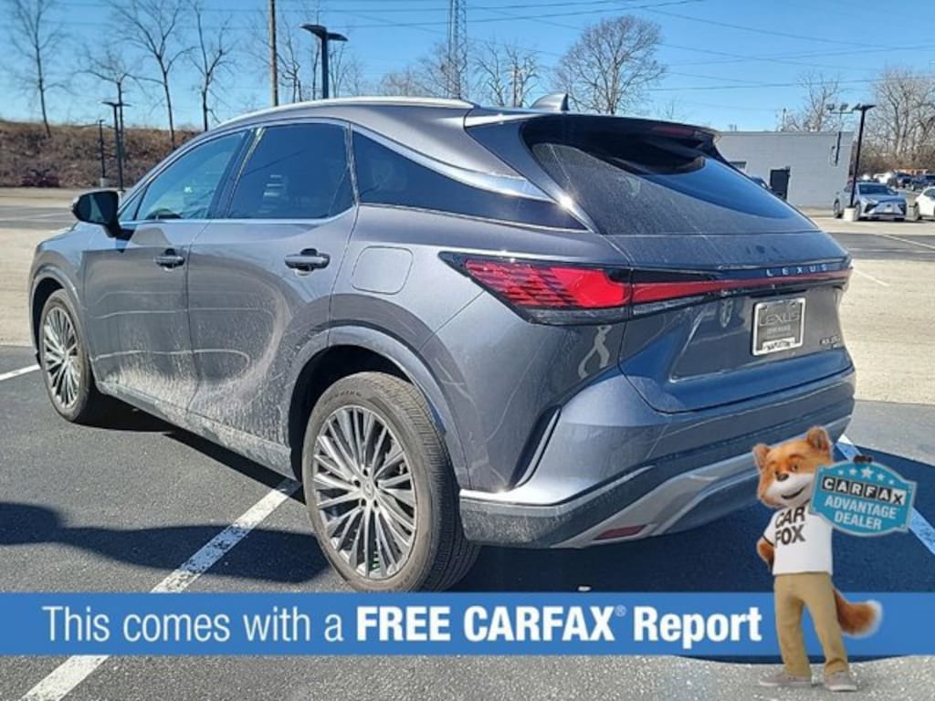 This RX is well equipped with Cold Area Package, Convenience Package (Lane Change Assist w/Lane Keeping Assist System), Technology Package, Exterior Parking Camera Rear, Heads-Up Display, Heated & Ventilated Front Bucket Seats, Heated Steering Wheel, Power Liftgate, Power Moonroof, Wireless Apple CarPlay/Wireless Android Auto, 10-Way Power Driver & Fr Passenger Seat Adjusters, 12 Speakers, 3.33 Axle Ratio, 4-Wheel Disc Brakes, ABS brakes, Active Cruise Control, Air Conditioning, Alloy wheels, AM/FM radio: SiriusXM, Anti-whiplash front head restraints, Auto High-beam Headlights, Auto tilt-away steering wheel, Auto-dimming door mirrors, Auto-dimming Rear-View mirror, Automatic Temperature Control, Brake assist, Bumpers: body-color, Compass, Delay-off headlights, Driver door bin, Driver vanity mirror, Dual front impact airbags, Dual front side impact airbags, Electronic Stability Control, Emergency communication system: Safety Connect (10-year trial), Four wheel independent suspension, Front anti-roll bar, Front Bucket Seats, Front Dual Zone A/C, Front fog lights, Front reading lights, Fully Automatic Headlights, Garage door transmitter: HomeLink, Genuine wood console insert, Heated Door Mirrors, Heated Front Seats, Heated Rear Seats, Heated rear seats, Illuminated entry, Leather Shift Knob, Leather steering wheel, Low tire pressure warning, Memory seat, Occupant sensing airbag, Outside temperature display, Overhead airbag, Overhead console, Panic alarm, Passenger door bin, Passenger vanity mirror, Power door mirrors, Power driver seat, Power passenger seat, Power steering, Power windows, Radio data system, Radio: Lexus Interface w/14" HD Touchscreen Display, Radio: Lexus Interface w/Mark Levinson Audio, Rain Sensing Wipers, Rear air conditioning, Rear anti-roll bar, Rear reading lights, Rear seat center armrest, Rear side impact airbag, Rear window defroster, Rear window wiper, Remote Keyless Entry, Security system, Semi-Aniline/Synthetic Suede Leather Seat Trim, Speed control, Speed-sensing steering, Split folding rear seat, Spoiler, Steering wheel memory, Steering wheel mounted audio controls, Tachometer, Telescoping steering wheel, Tilt steering wheel, Traction control, Trip computer, Turn signal indicator mirrors, Variably intermittent wipers, Ventilated front seats, Ventilated rear seats, and Wheels: 21".