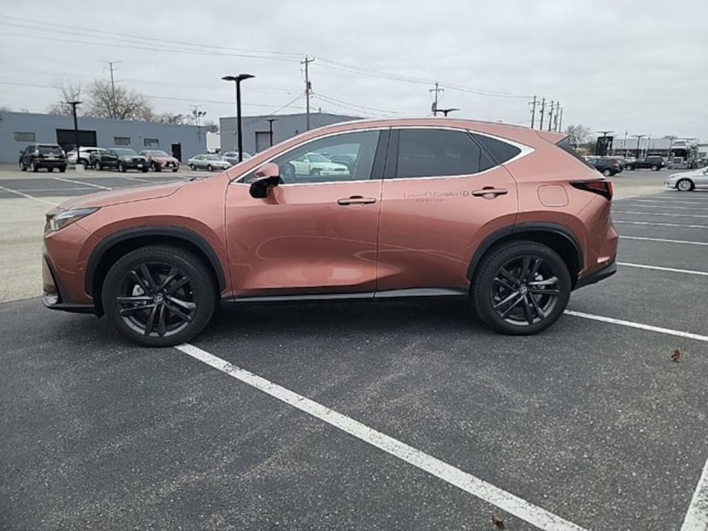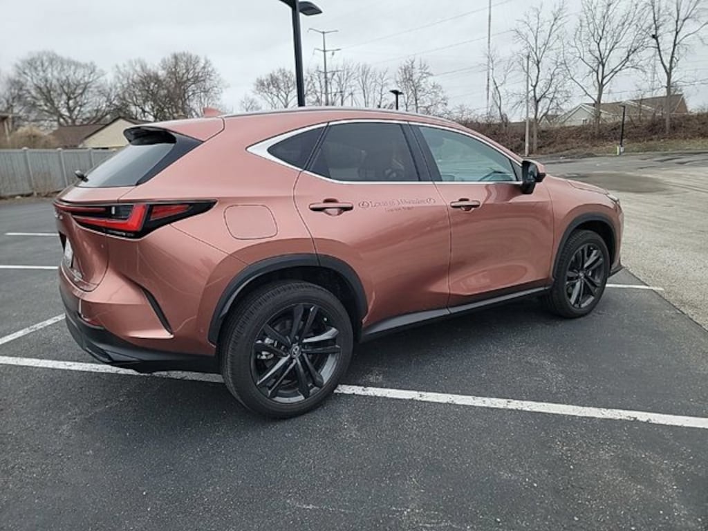 This NX is well equipped with Exterior Parking Camera Rear, Heads-Up Display, Heated & Ventilated Front Bucket Seats, Heated Steering Wheel, Mark Levinson Premium Surround Sound w/17 Speakers, Navigation System, Power Liftgate, Power Moonroof, Wireless Apple CarPlay/Wireless Android Auto, 10 Speakers, 4-Wheel Disc Brakes, ABS brakes, Air Conditioning, Alloy wheels, AM/FM radio: SiriusXM, Auto High-beam Headlights, Auto tilt-away steering wheel, Auto-dimming door mirrors, Auto-dimming Rear-View mirror, Automatic Temperature Control, Brake assist, Bumpers: body-color, Delay-off headlights, Driver door bin, Driver vanity mirror, Dual front impact airbags, Dual front side impact airbags, Electronic Stability Control, Emergency communication system: Safety Connect (up to 10-year trial subscription included), Four wheel independent suspension, Front anti-roll bar, Front Bucket Seats, Front Dual Zone A/C, Front fog lights, Front reading lights, Fully Automatic Headlights, Garage door transmitter: HomeLink, Genuine wood door panel insert, Heated Door Mirrors, Heated Front Seats, Heated Rear Seats, Illuminated entry, Knee airbag, Leather Seat Trim, Leather Shift Knob, Leather steering wheel, Low tire pressure warning, Memory seat, Navigation system: Drive Connect Cloud Navigation (3-year trial subscription included), Occupant sensing airbag, Outside temperature display, Overhead airbag, Overhead console, Panic alarm, Passenger door bin, Passenger vanity mirror, Power door mirrors, Power driver seat, Power passenger seat, Power steering, Power windows, Radio data system, Radio: Lexus Premium Sound System w/10 Speakers, Rain Sensing Wipers, Rear anti-roll bar, Rear reading lights, Rear seat center armrest, Rear window defroster, Rear window wiper, Remote Keyless Entry, Security system, Speed control, Speed-sensing steering, Speed-Sensitive Wipers, Split folding rear seat, Spoiler, Steering wheel memory, Steering wheel mounted audio controls, Tachometer, Telescoping steering wheel, Tilt steering wheel, Traction control, Trip computer, Turn signal indicator mirrors, Variably intermittent wipers, Ventilated front seats, and Wheels: 20" w/Dark Gray Metallic Finish.