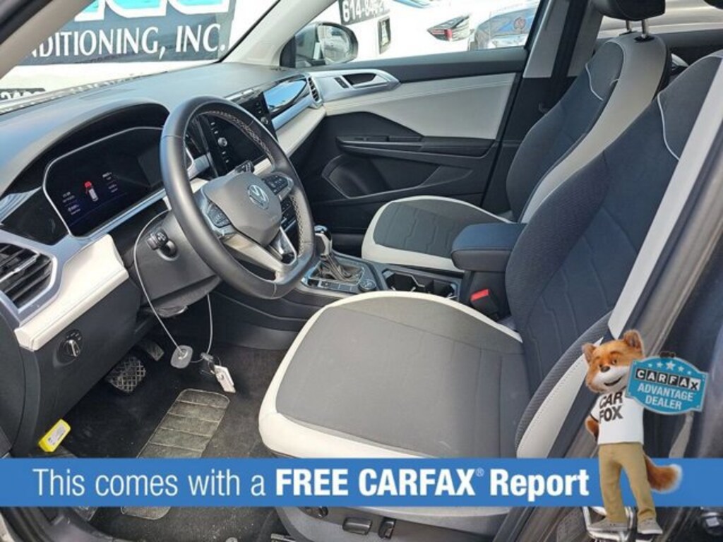This Taos is well equipped with Exterior Parking Camera Rear, Heated Front Bucket Seats, Heated Steering Wheel, Rain Sensing Wipers, Remote Keyless Entry, Steering wheel mounted audio controls, 4-Wheel Disc Brakes, 6 Speakers, ABS brakes, Active Blind Spot Monitor, Air Conditioning, Alloy wheels, AM/FM radio: SiriusXM with 360L, Auto High-beam Headlights, Automatic Temperature Control, Brake assist, Bumpers: body-color, CloudTex & Cloth Seating Surfaces, Compass, Delay-off headlights, Driver door bin, Driver vanity mirror, Dual front impact airbags, Dual front side impact airbags, Electronic Stability Control, Emergency communication system: VW Car-Net Safe & Secure 5-year, Four wheel independent suspension, Front anti-roll bar, Front Bucket Seats, Front Dual Zone A/C, Front reading lights, Front Strut Rear Multi-Link Suspension, Fully Automatic Headlights, Heated Door Mirrors, Heated Rear Seats, Illuminated entry, Leather Shift Knob, Low tire pressure warning, Occupant sensing airbag, Outside temperature display, Overhead airbag, Overhead console, Panic alarm, Passenger door bin, Passenger vanity mirror, Power door mirrors, Power driver seat, Power steering, Power windows, Radio data system, Radio: MIB3 Composition Media AM/FM/HD, Rear anti-roll bar, Rear seat center armrest, Rear window defroster, Rear window wiper, Security system, Speed control, Speed-sensing steering, Split folding rear seat, Spoiler, Tachometer, Telescoping steering wheel, Tilt steering wheel, Traction control, Trip computer, Variably intermittent wipers, and Wheels: 18" 2-Tone Machined Alloy.